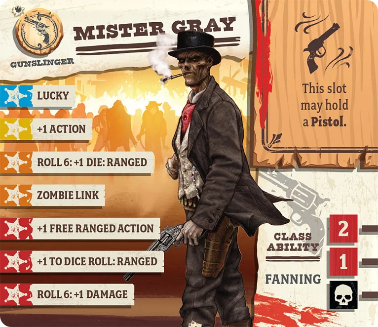 Mister Gray is… scary. Heck, he was damn near terrifying before whatever happened turned him into a zombie that isn’t a zombie. Some say his heart is so black the curse just uncovered his true face. He never cheated at cards in his life, but as a gambler of notorious skill, he learned the art of the quick draw at a young age. And as he got older, and meaner, that trigger finger developed a permanent twitch. Even a hint of cheating on anyone’s part would see that six-shooter roar to life.