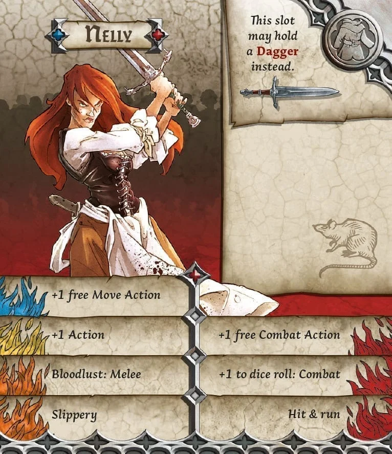 Never quite able to get ahead, Nelly found herself stuck in the life of a tavern wench from an early age. She avoided the usual traps such young women often fell victim to, such as becoming a mistress for some petty noble, or working in some brothel. Ever a dreamer, bright-eyed Nelly craved something more, but didn’t really know what, or how to get it. Until the zombies appeared. Turns out bashing grabby patrons in the head with full tankards isn’t too much different than bashing grabby zombies with a club. A natural with just about any weapon, Nelly has found her purpose in life: Zombicide!