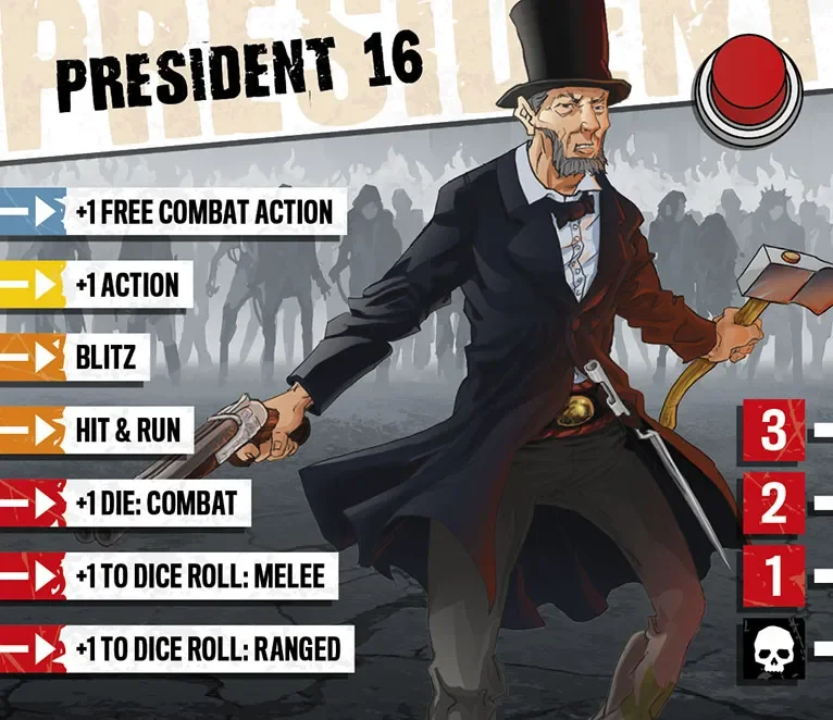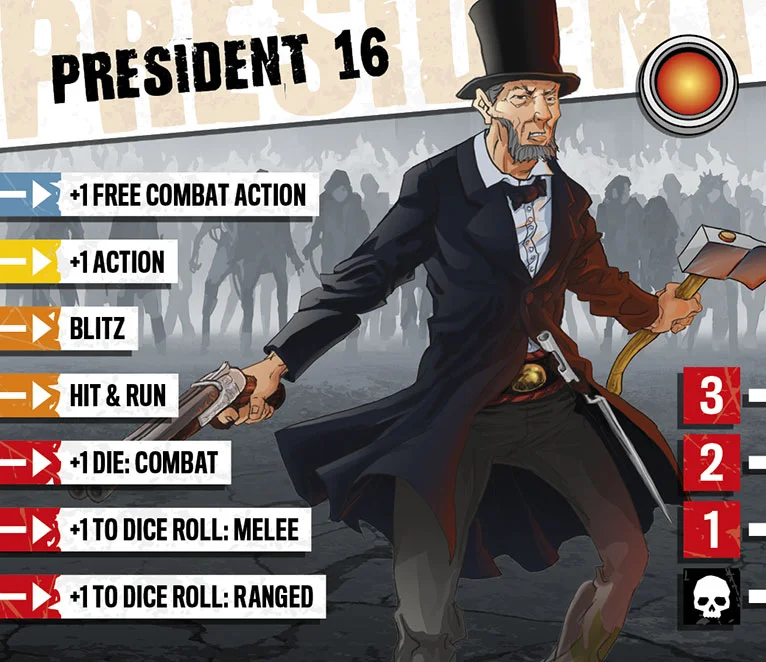 The President’s list of accomplishments include the Homesteading Act, the Department of Agriculture, progressive taxation, emancipation of the slaves, and absolutely wrecking the traitorous Confederates. So, a bunch of zombies should be no problem, right? As a symbol of inspiration, the President knows that his oratory skills are insufficient to ending this zombie apocalypse. It’s a good thing he grew up on farms in Kentucky and Indiana, learning to shoot and swing an axe. Not content to sit at a secure location this time around, you can expect the President to be out there among the other survivors, leading by example.