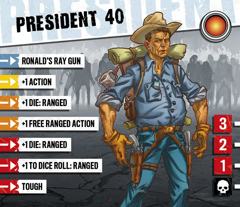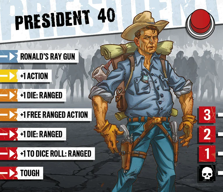 The President developed plans for dealing with communism in China, the Soviet Union, and Eastern Europe, but never thought he’d have to deal with zombies. But, that said, it really lets his true persona shine forth. He always loved his time in Hollywood and Westerns in particular. So it wasn’t hard to dig up some boots, a hat, a *mighty* belt buckle, and a couple of six-shooters. If anyone can show these kids how to survive in the rough-and-tumble world of a zombie apocalypse, it’s the President.