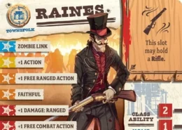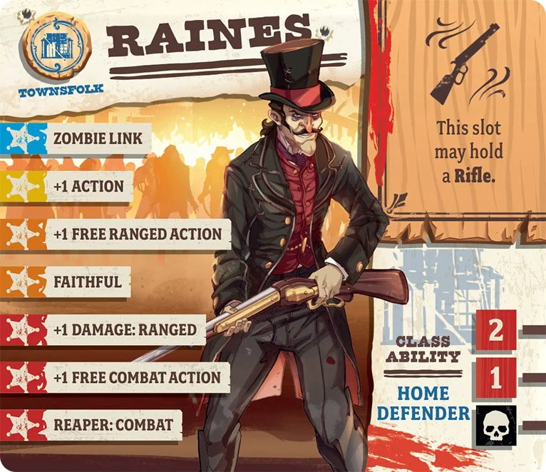 Mister Raines was the local undertaker, a morbid, but necessary calling. As a young man he fell into the work by accident, having transgressed the law in a serious fashion and being sentenced to work with the local undertaker during a time of plague. The old man’s patience with his young parolee taught Raines a fair bit about the world, and an honest if grisly trade. Raines fights the hordes with his fellow survivors now, entertaining himself (if no one else) by speculating on the original causes of death among the zombies he shoots.