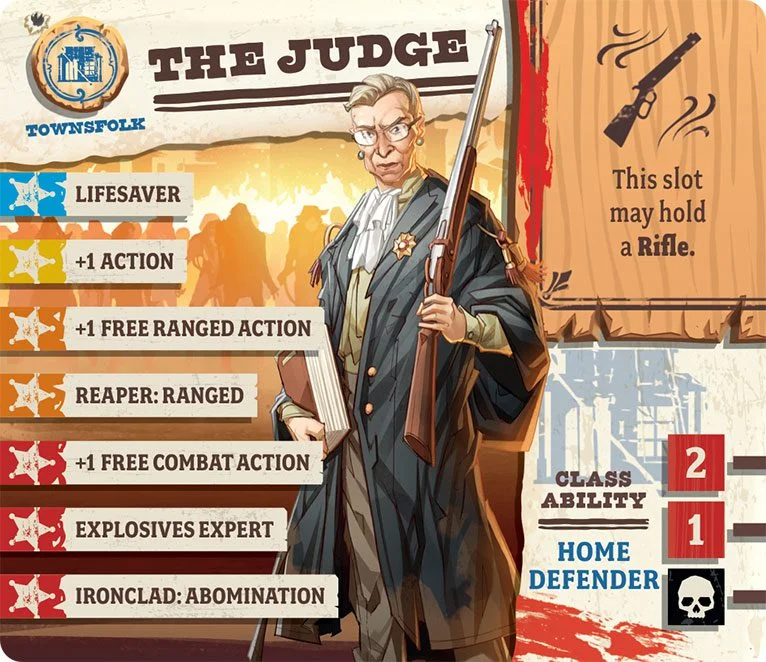 Life as a circuit judge in the West involved large amounts of travel between states and territories, dispensing justice in a region then moving on to the next. Few are more illustrious (and sometimes notorious) as the woman only known as The Judge. Her habit of seeing straight through to case’s core and dispensing even-handed sentences is known across the West, as is her skill with the loaded rifle she keeps besides her at all times, even when at the bench. Make trouble in her court, and the bailiff might be tossing out your corpse.
