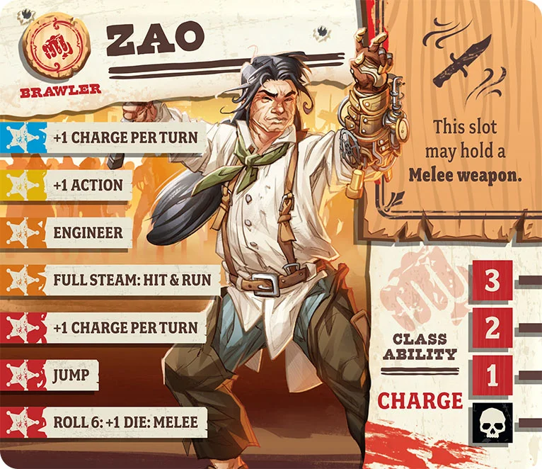 Zao brings Far Eastern philosophies to the world of engineering, where patient methodology often outperforms reckless experimentation. Zao traveled far across the Pacific to learn Western techniques and improve his understanding of the laws and principles governing engineering, and along with that he brought his unusual fighting techniques, themselves a method of relaxation and meditation, and on occasion self-defense. Little did he expect to be using his combat skills far more than his engineering acumen. But, such is the way of a zombie invasion.