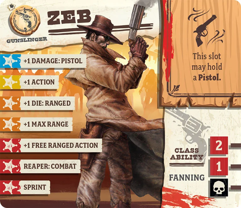 Zeb might’ve learned a more honest trade if he’d spent more time in his father’s gun smithy rather than practicing with their wares. As it is he still tinkers here and there, always finding cause to put more barrels and bullets on more traditional designs. And it does aid him well with his calling as a gunslinger for hire. He may not be the fastest gun in the West, but he sure is the loudest, which counts for something against zombies. Not many packs can stand up to his hail of lead.