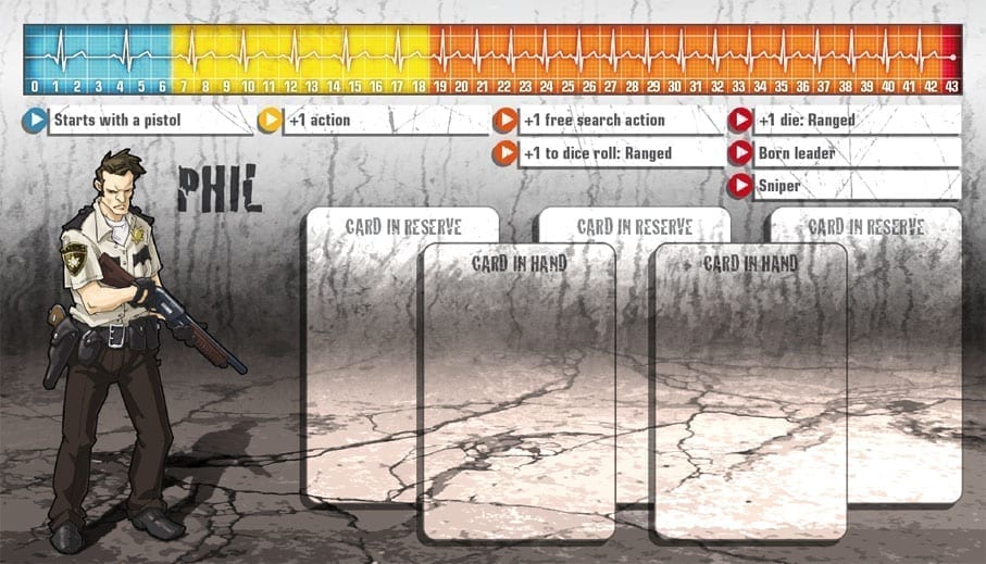 Phil is the helpful guy. He is of course a skilled shooter, but in fact his real talent is helping anybody who needs it. Taking care of dangerous zombies, no matter the odds, no matter if the game begins or is about to finish, finding the last canned food needed to achieve the scenario, giving one more Action to another Survivor in order to make him survive… Phil is a cop. A real one. He protects and serves!