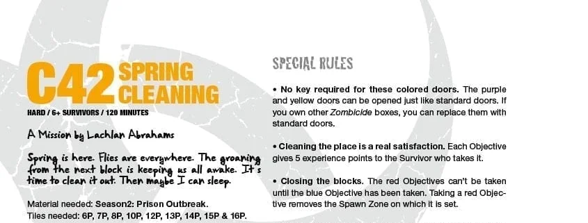 Classic MissionSpring CleaningLachlan Abrahams Spring is here, the sun shines on. With so many zombies packed in the prison nearby, all kind of pests ae making your life miserable. A little cleaning should do the trick! PDF 5 April 2014 https://cdn.svc.asmodee.net/production-zombicide/uploads/image-converter/2016/01/Mission_C42.webp 1094 845 Thorn https://cdn.svc.asmodee.net/production-zombicide/uploads/2021/11/logo-zombicide-r2.png Thorn2014-04-05 16:52:412018-05-28 09:32:01Spring Cleaning