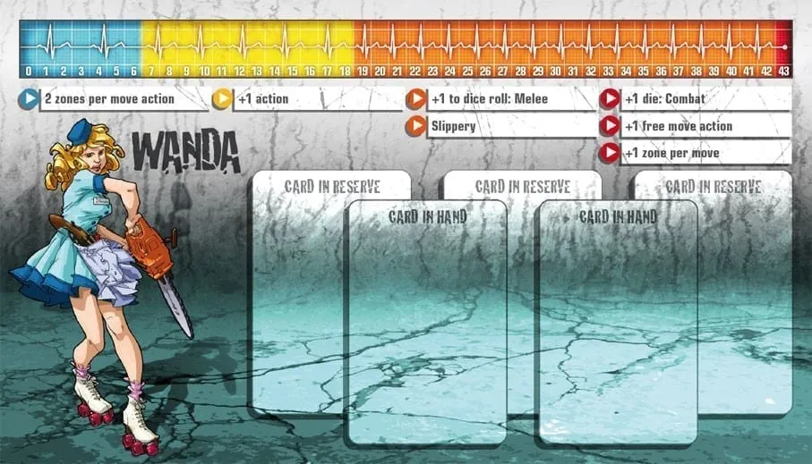 • Thanks to her extraordinary speed, Wanda is the team scout, opening doors, grabbing objectives, and driving Zombies in the appropriate direction. Slippery is a good choice at the Orange Level, making her difficult to grab by Zombies. Depending on the situation and the mission, she can either choose “+1 Zone per Move” or “+1 free Move Action” on the Red Level. “+1 Zone per Move” offers an unmatched movement speed. With 12 Zones per turn, Wanda can go anywhere and back while the other Survivors are just half way there. “+1 free Move Action” offers Wanda more flexibility. She can take more Movement Actions with less speed, which can be useful on little maps. This “fast Wanda” has no favored weapon. In her scouting role, Wanda counts more on experience points granted by objectives than those gained through Zombie extermination.
